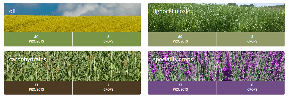 In the landing page of the platform (Home Page), users can preview the four crop categories that the PANACEA platform supports: 1) Oil, 2) Lignocellulosic, 3) Carbohydrates and 4) Speciallity crops. Figure 4 depicts this filter functionality, where for each category the user can preview a statistical information on how many projects and/or crop related information exist in the repository. By clicking on a statistical number the platform redirects the user in the Search Results page to preview the corresponding information.