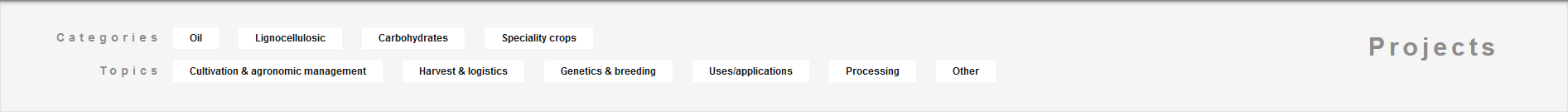 In the landing page of the platform (Home Page), users can preview the four crop categories that the PANACEA platform supports: 1) Oil, 2) Lignocellulosic, 3) Carbohydrates and 4) Speciallity crops. Figure 4 depicts this filter functionality, where for each category the user can preview a statistical information on how many projects and/or crop related information exist in the repository. By clicking on a statistical number the platform redirects the user in the Search Results page to preview the corresponding information.